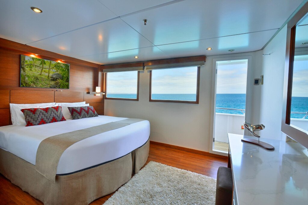 Four Category 5 Staterooms—with two large windows, private balcony, convertible queen/twin beds, desk, ample closets, and large bathroom with plush bathrobes and stand-up showers. In addition, staterooms have a stocked mini-bar, in-room Wi-Fi, and a flat-screen TV. Located on the Main Deck, the staterooms are 172 square feet with a 43-square-foot balcony with seating.