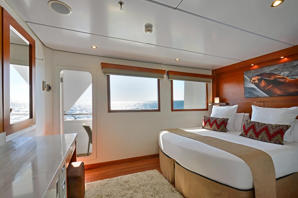 National Geographic-Lindblad Expeditions welcomes the newest and most intimate addition to the Galápagos fleet, National Geographic Delfina. Setting sail in early 2025, this sleek, contemporary vessel is a luxury catamaran designed for cruising the Galápagos Islands in style and stable comfort. The elegant, well-appointed ship, with a double hull, accommodates 16 guests in eight spacious, air-conditioned double staterooms with polished wood décor. Located on two decks, staterooms have either a private balcony (Category 5) or direct access to an expansive wood deck (Category 4).