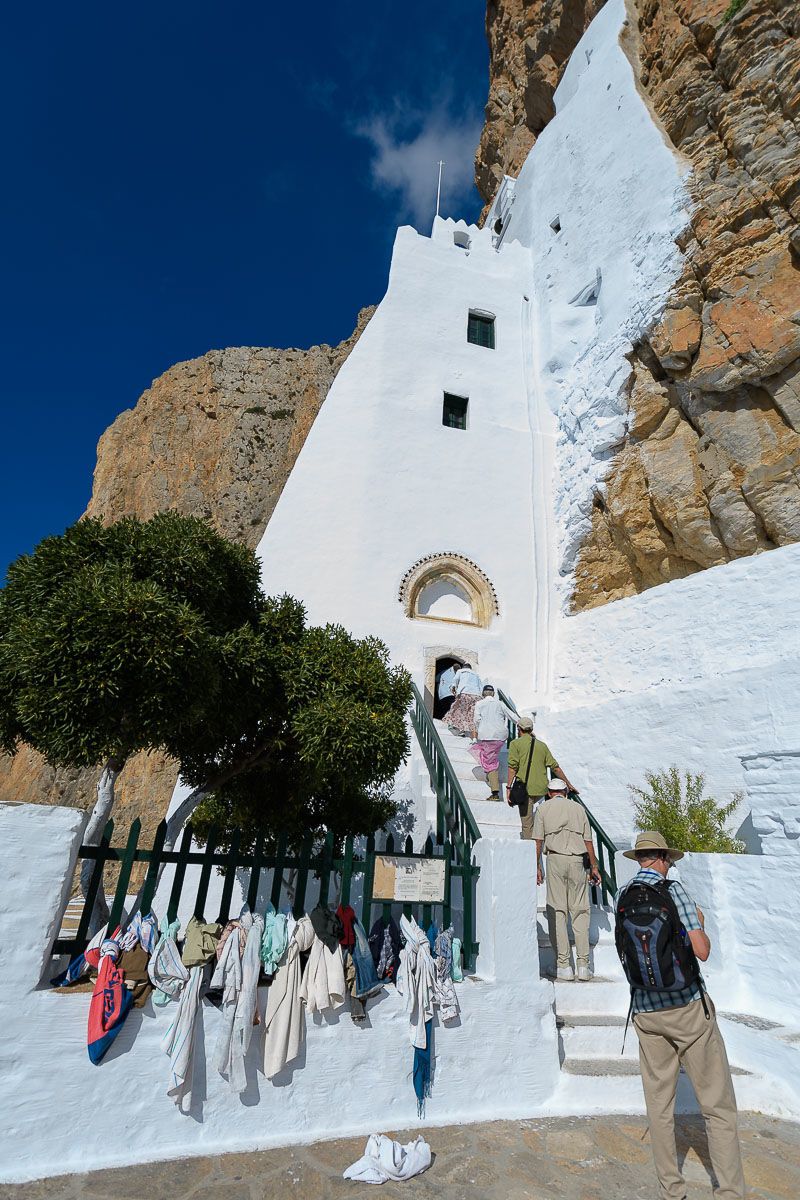 Last night was calm as we were sheltered away from the strong Meltemi winds that have been following us the last days. The bay of Katapola at Amorgos Island is known for being one of the safest harbors in the Aegean! Early this morning we boarded the motor coaches and drove to the east side of Amorgos to visit the 11th century Monastery of Hozoviotissa. This monastery offers breathtaking views as it is glued on the steep cliffs and the only access is by hiking up roughly 300 steps.