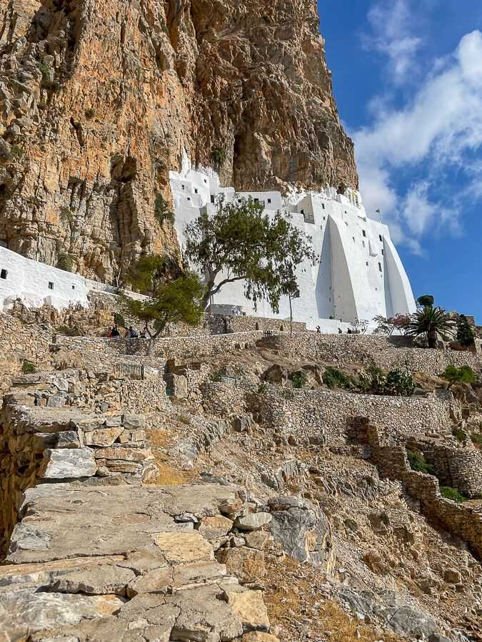 This morning, we took a short ride up to the Hozoviotissa Monastery. This architectural wonder was placed according to the discovery of a religious icon. Hence, it appears to levitate on the sheer cliffside. Many of us climbed the 350 steps to investigate this unique homage. No room in the monastery is wider than 15 feet.