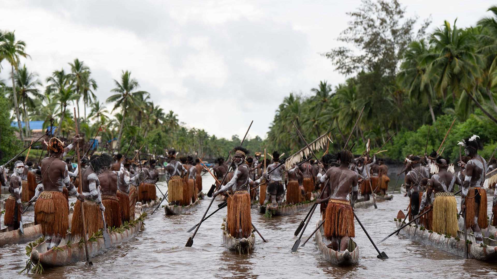 Today, we were privileged to gain a unique insight into the lives of the Asmat people in West Papua. As we approached the river, an awe-inspiring and slightly intimidating sight awaited us—90 or more war canoes paddling toward us, leading the way to Per Village. Their powerful presence set the tone for an unforgettable journey into the heart of Asmat culture.