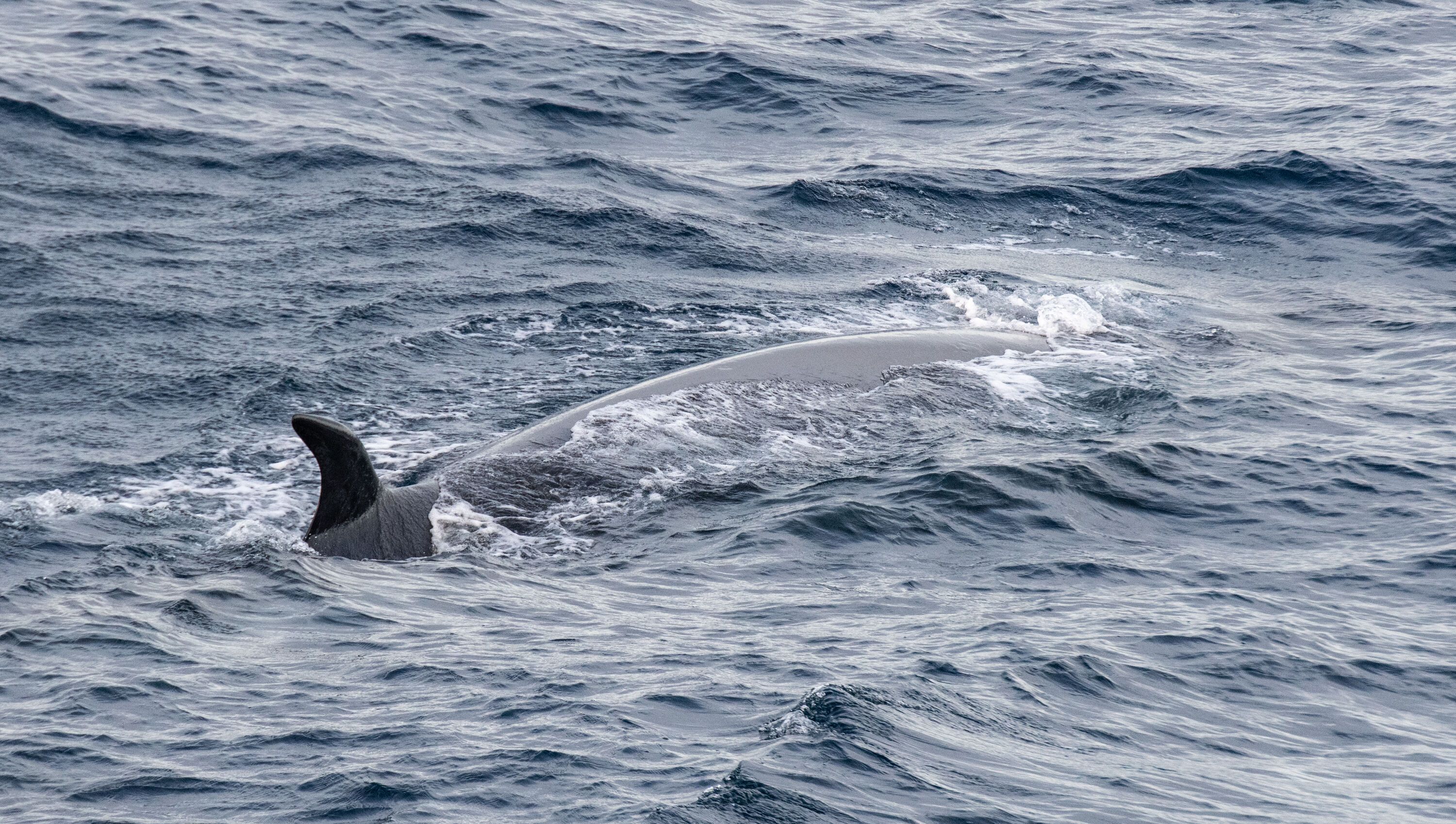 After three wonderful days in New Zealand’s Subantarctic Islands, we are making our way south to Macquarie Island, within the Tasmin State of Australia. Macquarie is a UNESCO World Heritage site, namely for its fascinating geology. The intact seafloor was pushed above sea level by mid-oceanic convergence to form the island. The same ridge that produced Macquarie Island also creates ocean currents that generate biodiverse hotspots, and we were greeted with evidence of just that this morning. During breakfast, we spotted several whale blows in all directions around National Geographic Endurance. We sighted two southern right whales, one of the rarer cetaceans in the Southern Ocean, and numerous sei whales. We were also escorted by a large pod of long-finned pilot whales. The large males and pairs of mothers and calves were just off the bow. They had large, round, shiny heads, white blazes, and beautiful saddles. It was truly a treat to watch them effortlessly move through the water as a unit before disappearing together in one fluid dive.