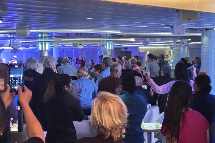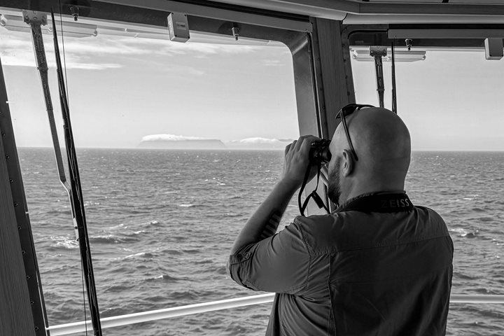 We zoomed over to a large piece of ice where Hotel Director Laura and Chief Bartender Derek had set up a lovely beverage station. Hot cocoa galore, along with the possibility of adding a nip of Baileys or Kahlua, if you so pleased! The ice was stunning with multiple freshwater pools of a turquoise hue. As snowballs were thrown and snow angels made, a memorable experience was had by all. A call came over the radio from Captain Martin. Fog was rolling in, and we were needed back at the ship. Never a dull moment aboard National Geographic Resolution!