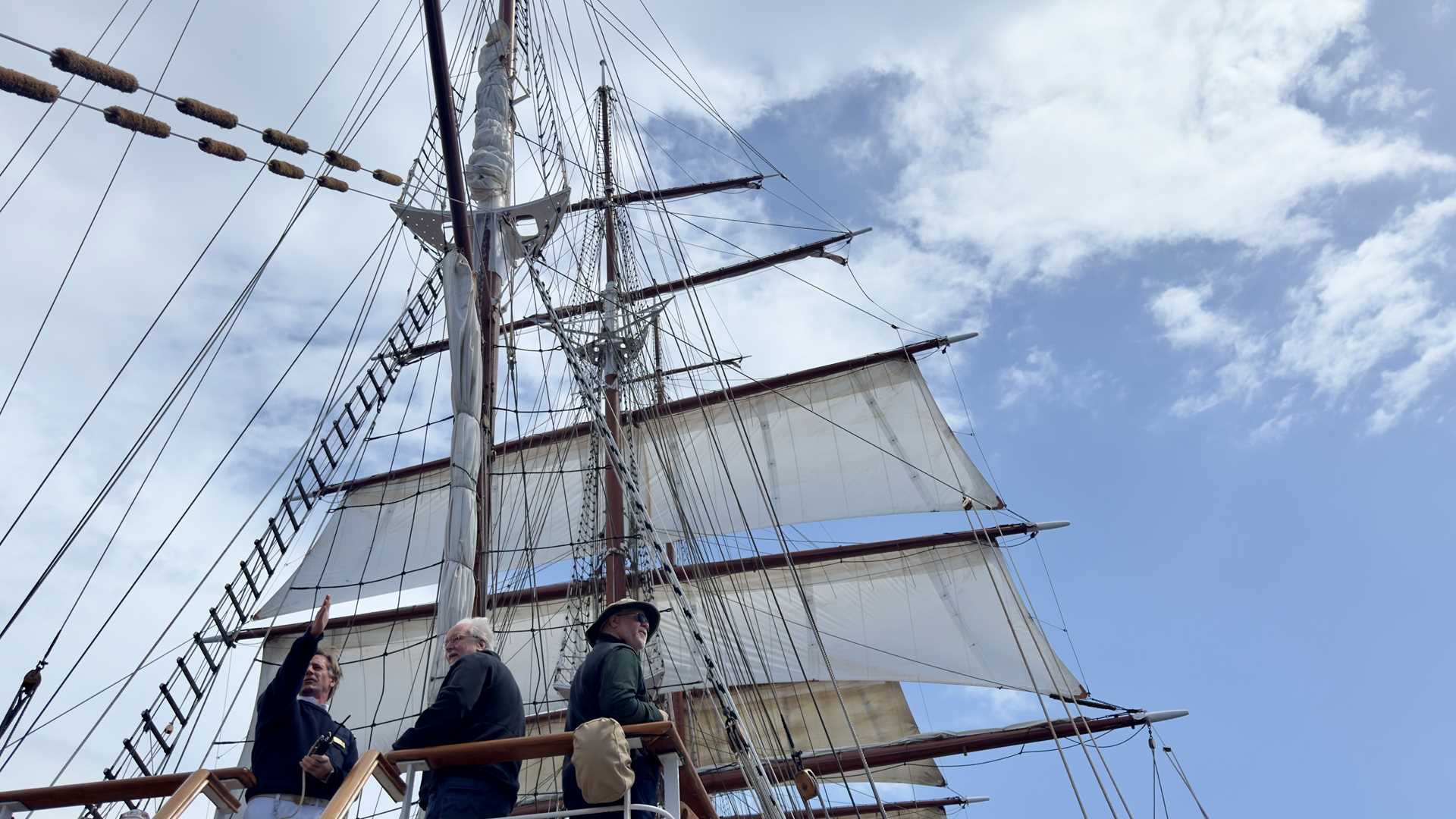 You couldn’t ask for a more perfect day to go sailing in the Mediterranean! The day began with dolphins playing in the bow wave. After breakfast in lively seas, the captain gave the order to hit the rigging, and the crew scrambled aloft to set the sails. A small squall blew in just after the sails were up to add some excitement. With the winds rising quickly and gusts of over 50 knots, the crew brought in some sail but still had us zipping along at 8 knots with the ship heeled to 12.5 degrees! With that thrill abated but still other squalls on the horizon, the captain talked us through the maneuver of “wearing the ship” to change our direction and chase some blue skies. We spent the rest of the day sailing gloriously with only seven sails set but still cruising along at 7 knots, riding the wind and waves towards Cagliari.