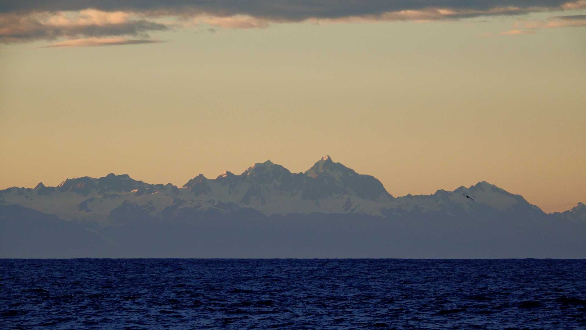 With smooth, following seas, National Geographic Orion made her way north along the western coast of New Zealand’s South Island. As day broke, the massive peaks of the Mount Cook Range were under clear skies with a touch of alpenglow light on the ice- and snow-covered peaks. At 3,724 meters, Mount Cook – or more appropriately called by its Maori name, Aoraki (Sky Piercer) – is the tallest peak in New Zealand, the crown of the Southern Alps. We sailed for most of the day with this dramatic coastline on our starboard side in clear view. Late afternoon brought light showers and low clouds, only to be cleared off by northerly winds and high pressure.