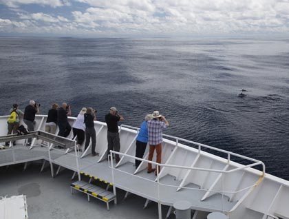 All the usual suspects are up and about and on the bridge to see the new day dawn. There are very few birds about, but as always, a lot of laughter, banter, and fun. The open bridge policy is a truly precious aspect to the long Lindblad tradition so many of us share. Just before breakfast we spot a lone Bulwer’s petrel, which brings joyous responses from everybody.