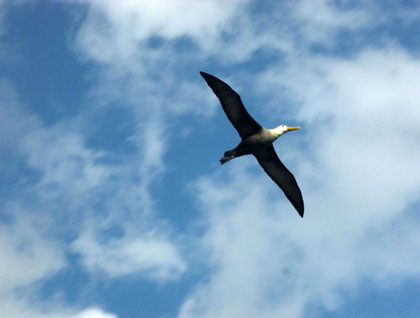Sea conditions today were perfect. Of course, if National Geographic Orion were a sailing ship, we would probably have not enjoyed the day so much as we would have been becalmed. We were “like a painted ship upon a painted sea.” As far as the eye could see, there were puffy clouds scattered about, many of which produced picturesque reflections. It was a bit odd that there appeared to always be less cloud coverage overhead than anywhere else. This optical illusion was caused by the foreshortened lower angles of our views towards the horizon, making the clouds looked more concentrated farther away in all directions. Even so, we could observe several huge isolated cumulo-nimbus thunderheads here and there that were dumping huge amounts of concentrated rain into the ocean. This seemed a waste of freshwater when one considers the many drought-stricken terrestrial areas around the world.