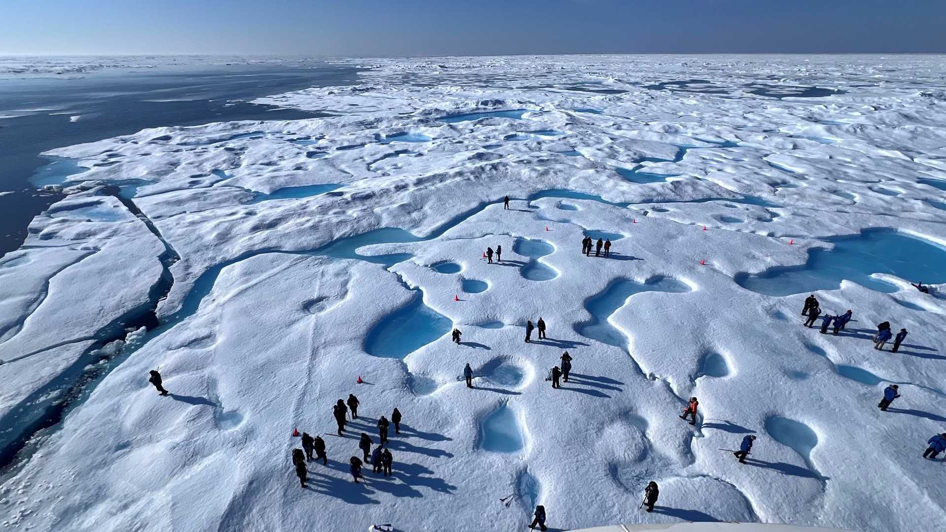 We woke this morning to find National Geographic Resolution back in the pack ice. During breakfast we drove the ship deep into a large pan of ice and put the gangway down. Once the staff had scouted and secured the area, we were able to walk on the ice among the beautiful blue pools of surface meltwater. This was an exceptional opportunity, and we were very fortunate to be able to take advantage of the perfect weather and ice conditions. The hotel department even brought out champagne so we could toast this magnificent landing.