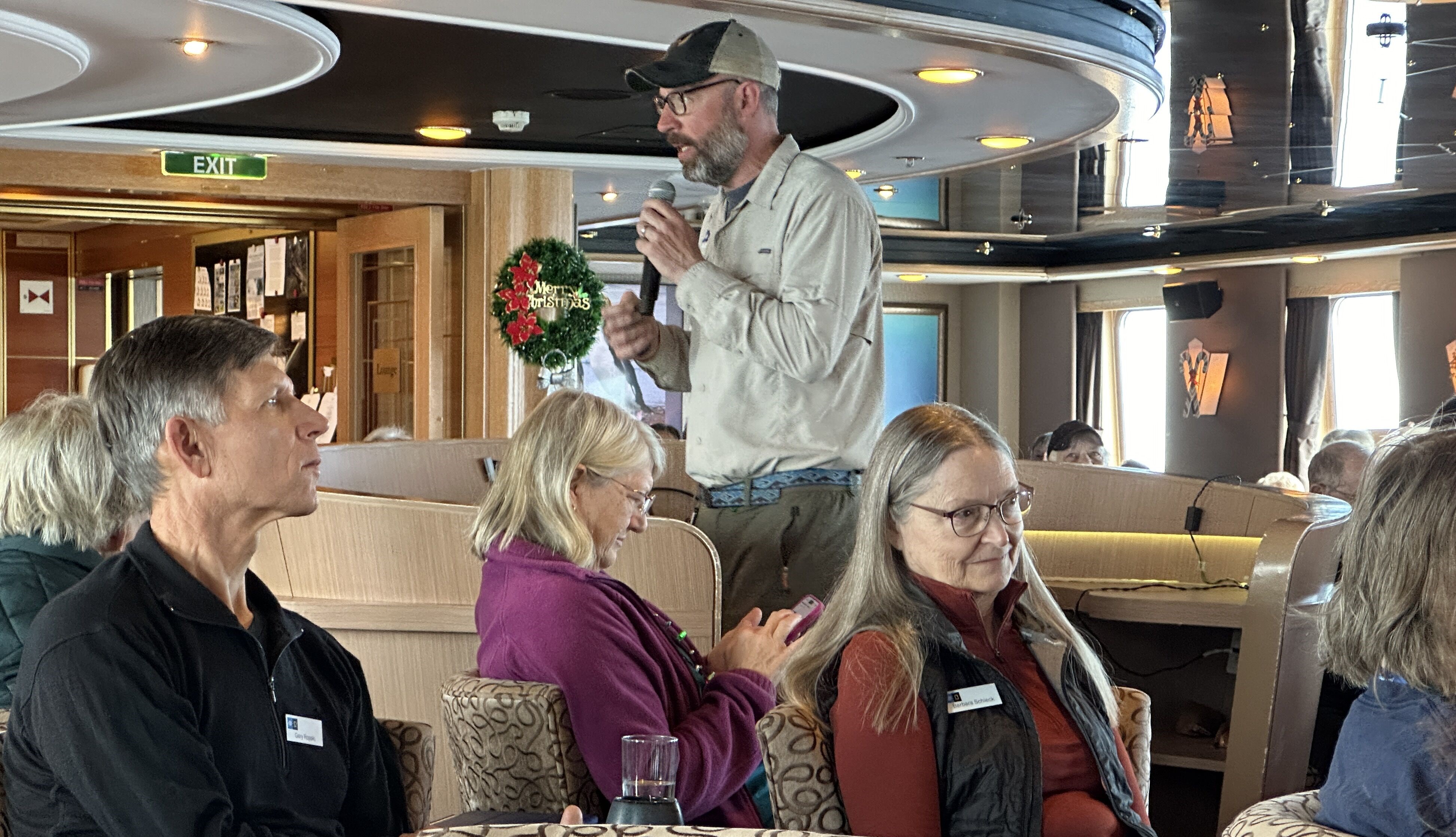 Photo caption and credit: Naturalist Doug Gaultieri talking about Subantarctic penguins. Photo by Alexander Hillary