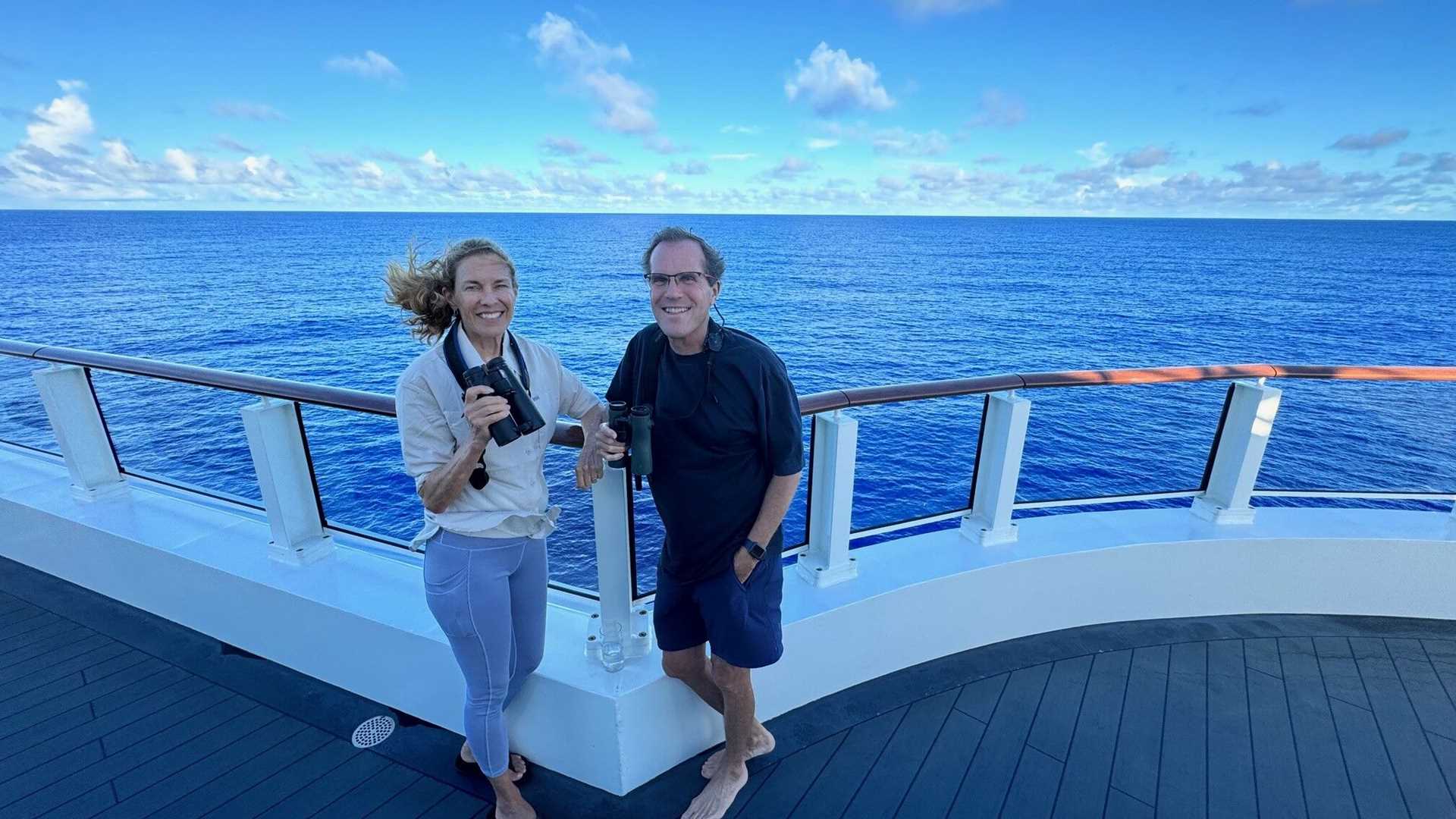 Photo caption: Guests enjoy some birdwatching from the top deck.