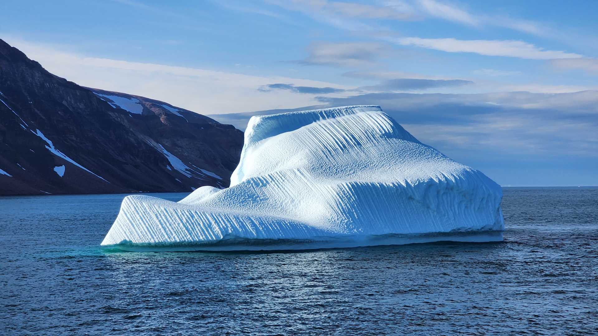 This morning, we awoke to beautiful colors covering the shorelines of Bowdoin Fjord. Several guests had stayed up into the small hours to watch the golden hour highlight the yellow and red hues among the sedimentary rock layers. The new day saw us cruising through icebergs littering Inglefield Gulf into Barden Bay. Here the scout team investigated several landing spots before selecting the head of the bay, close to where the glacier brings thousands-year-old ice from the Greenland Ice Cap into the fjord and out to Baffin Bay. The remains of the terminal moraine offered us a cobbly walk to an overlook over the glacier with both floral and insect highlights. Some guests opted for a leisurely Zodiac cruise around the bay, imagining the histories of the beautiful icebergs littering the red surface and dyed various shades by the silt running off the iron-enriched shorelines.