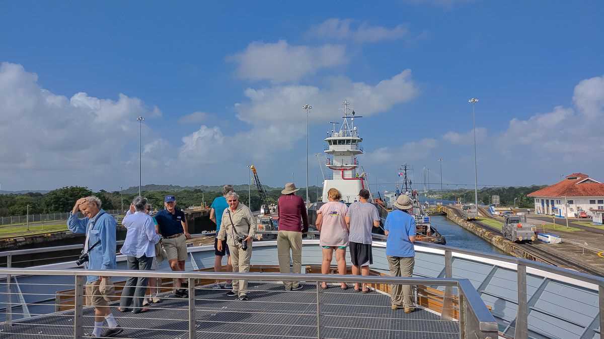 After coming back from the hikes and after a wonderful lunch, the third pilot of our trip arrived, at 1:00 p.m. sharp, and began repositioning us further north towards the Gatun Locks, the last three locks before exiting into the Caribbean Sea. With unbeknownst good luck, we began our transit right at 2:00 p.m. and we had a magnificent view of the working of the locks, locomotives, rowboats, tugboats and our companion vessel in the locks. If this was not enough, as we exited the last set of locks and the Caribbean Sea opened to us, a final gust of wildlife faced us: