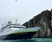 During lunch the ship moves towards our stop, a small island called Chinese Hat. The same stark volcanic features dominate our view, and once more we head out for snorkeling. This time many of us have a more lasting encounter with penguins, since there are several in the calm waters, seemingly careless about our presence, hunting the small anchovies that litter our underwater view.
