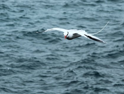 After lunch I got everyone to join me on the top deck, above the bridge, binoculars and cameras in hand. We were hoping for a glimpse of flamingos while slowly passing by one of the Bainbridge Islets, off the shores of Santiago Island. One of these volcanic tuff cones had a completely circular saltwater lagoon inside at sea level. One side of the volcanic cone has been eaten away by eons of wave action, until only a low bluff separates it from the ocean today. From the top deck, we stand a chance of peeking inside, and today we were super-lucky. I counted 15 flamingos, some swimming like pink swans, others standing along the edge. Success!