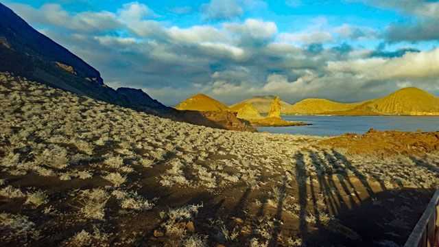 During the first full day of our expedition we explored the central islands of the archipelago. Early this morning we awoke to a beautiful sunrise, with warm sunlight lighting up the stunning volcanic landscape of Bartolome and adjacent Santiago Islands. Bartolome is considered one of the jewels of the Galapagos; it is a small island that is a field guide to geological forms and shapes. Here, we can find the iconic landmark of the enchanted isles: Pinnacle Rock.