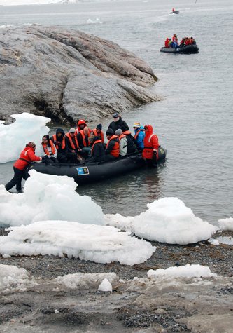 In the afternoon, we explored the basaltic shoreline of Santiago Island by Zodiacs. The impressive volcanic formation of Sombrero Chino captivated our explorers as we looked for Galapagos penguins, blue-footed boobies, pelicans and herons. The afternoon ended with a colorful sunset and the delightful sight of 15-inch high penguins heading back to their nesting grounds. Another wonderful day in paradise.