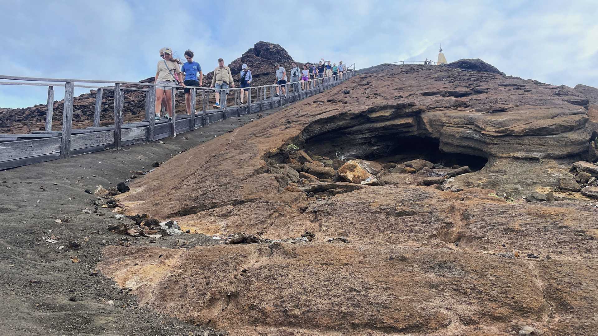 We are on the fifth full day of our expedition, and today was another spectacular one. Very early in the morning, before breakfast, we boarded our Zodiacs and hiked to the summit of Bartolome Island. This island is famous worldwide because of its breathtaking landscape; it offers not only amazing volcanic scenery, but a full view of the pinnacle rock and Sullivan Bay. For those guests that preferred a not-so-intense option, we enjoyed a Zodiac ride where Galapagos penguins, sea lions, and blue-footed boobies were the stars of the show.