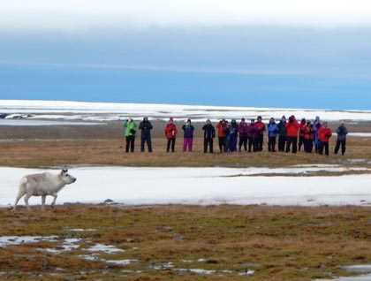 As we made our way up the beach to the moss-covered tundra, several reindeer were seen foraging on the slopes. Most of the reindeer were young ones and may have never seen humans before. A couple of them ran towards the groups to get a closer look; once satisfied that we were of no possible harm or no interest they moved on and continued feeding.