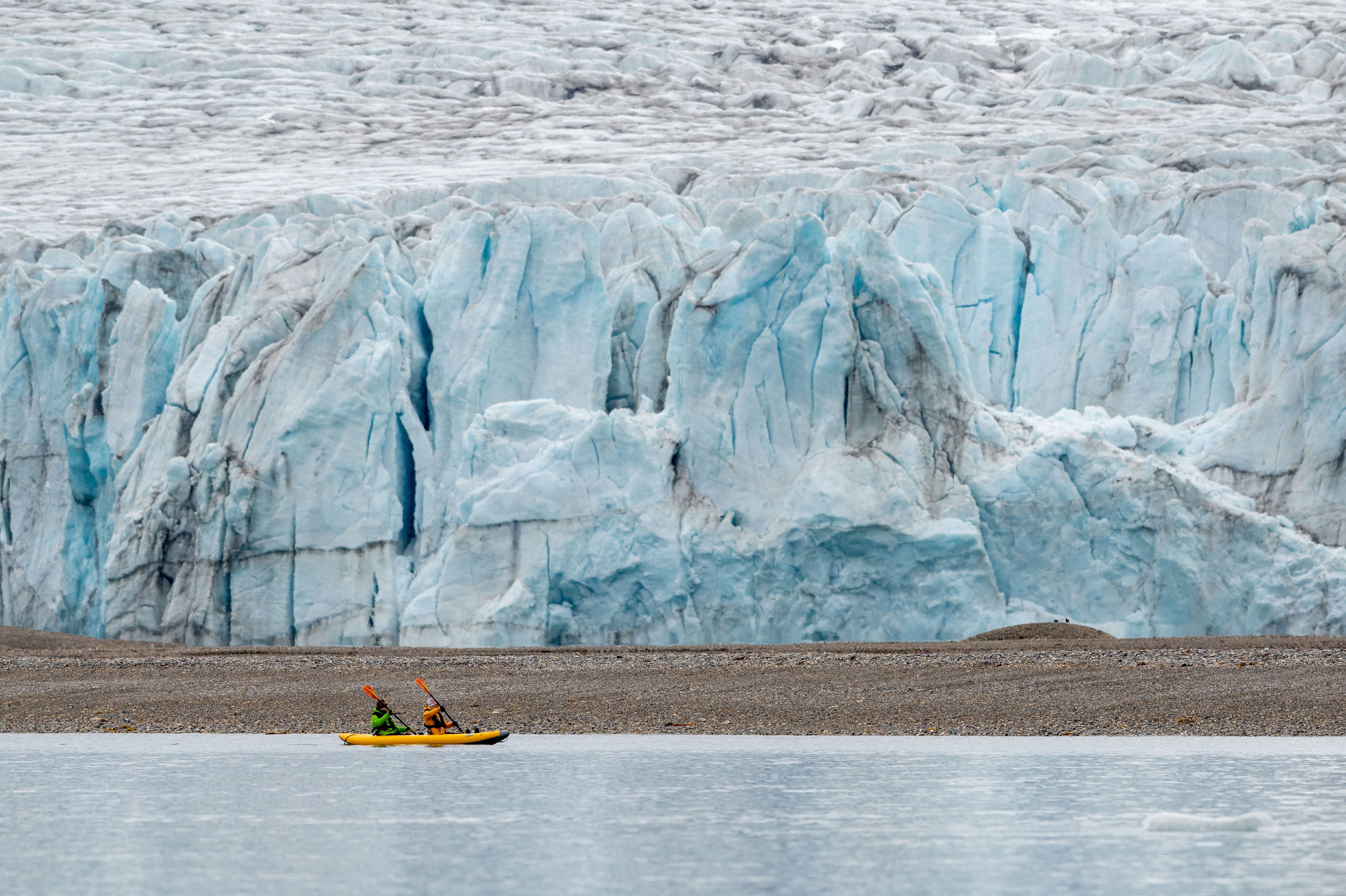 Aboard National Geographic Resolution, we can’t get enough of Svalbard – so much so that we extended our trip here by a full day to make the most of our current position and the weather forecast! This morning the ship sailed into Bellsund and we set out to explore the beautiful Recherchefjord. The adjacent semi-tidewater glacier has formed a terminal moraine that is now almost fully dammed, resulting in an iceberg-filled lagoon that was perfect for Zodiac tours, while an adventurous group of kayakers paddled around nearby.