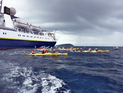 National Geographic Sea Lion arrived to the anchorage area right before breakfast. Out on deck, we felt a cool breeze while the sky began to get covered with different species of sea birds. Right in front of us was a nice rockery covered with a deciduous trees and cacti.