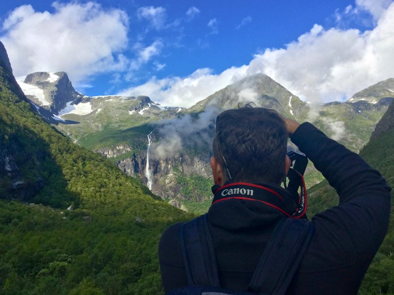 The valley ends at the trail up to the Briksdal Glacier. A wandering path passes by a series of small waterfalls, and then the cloud of mist welcomes us to a huge waterfall. We quickly pass through the spray, and continue higher and higher. All along, photo opportunities are in every direction. Gorgeous flowers line the trail, making great foreground to frame the surrounding glaciers and waterfalls. Every direction is a new and different shot, and was great material to practice all that we learned on this trip. Or, it was wonderful just to enjoy this incredible scenery.