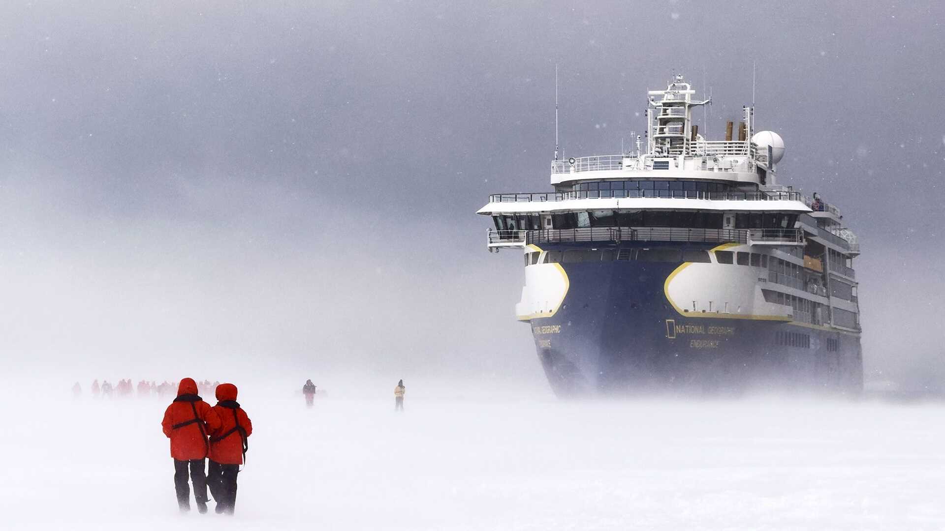 After several attempts to come alongside the fast ice, we opted to ferry guests onto the frozen sea ice with Zodiacs. Some guests chose to cross-country ski while others opted for a blustery stroll over the challenging terrain. There were a few emperor penguins, and many Amelies transited past in some sort of hurry. I am not sure where they were going to or coming from, but they seemed intent. Neither species seemed too bothered by us being there. It was a truly Antarctic summer day, with loose snow whipping around us.
