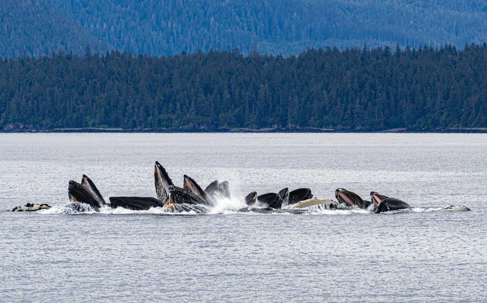 Wildlife on parade this morning in Freshwater Bay, just off Chatham Strait. Well before breakfast we spotted a group of at least nine humpback whales doing a unique behavior called cooperative bubble net feeding. Spectacular! While watching the whales, a brown bear with three small cubs was walking along the shore in full view.