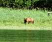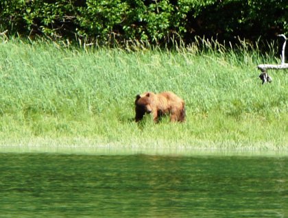 For the remainder of the day we explored Kelp Bay on the east side of Baranof Island. At the end of Kelp Bay’s middle arm, we walked in sunny, summerlike conditions through a huge meadow. We discovered many signs of animals that live in the area: bear scat, deer tracks, and even deer antlers were hidden in the tall beach rye grass and among yellow, red, and white wildflowers. We followed animal trails, and found that brown bears had been digging to get at plant roots. Among the spruce trees the air was cool under their moss-draped branches. We walked across shallow, wide streams.