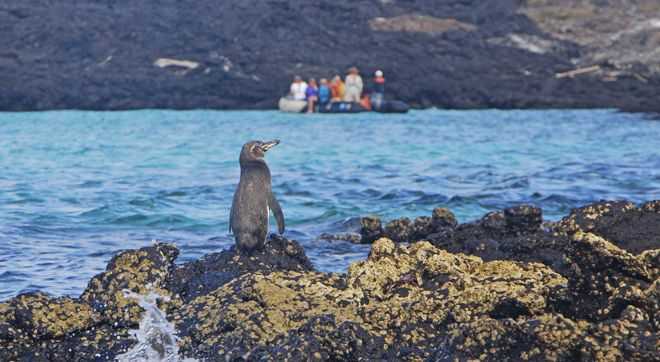 Chinese Hat Island is a satellite of Santiago Island with a beautiful shape and color. We explore it by Zodiac to look for wildlife. We spy a couple of penguins standing on the rocks, as if waiting to greet us. They are cute, but also special for being the only penguins to live and nest in the tropics. Sea lions were not expected, but they are here and we feel lucky to have encountered them.
