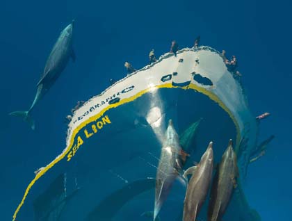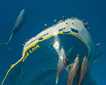 The ocean’s surface was flat and glassy. Troublesome wind was but a memory as the bright horizon soon gave us a brief glimpse of a two-layered green flash. Off and on throughout the morning we watched long-beaked common dolphins in the distance or up close riding our bow wave and surfing on our wake. At one point we peered into the distance to see a confusing combination of dorsal fins that turned out to be both bottlenose dolphins and short-finned pilot whales together. There were several large male pilot whales that approached the ship. They have enlarged dorsal fins that appear stretched along the back and have huge heads that look like they carry a pot as a nose. Their foreheads are used as acoustic lenses for focusing sound generated near their blowholes during echolocation. As each one approached, we first saw the water distort into a dome and then transform into a shiny black watermelon of a head.