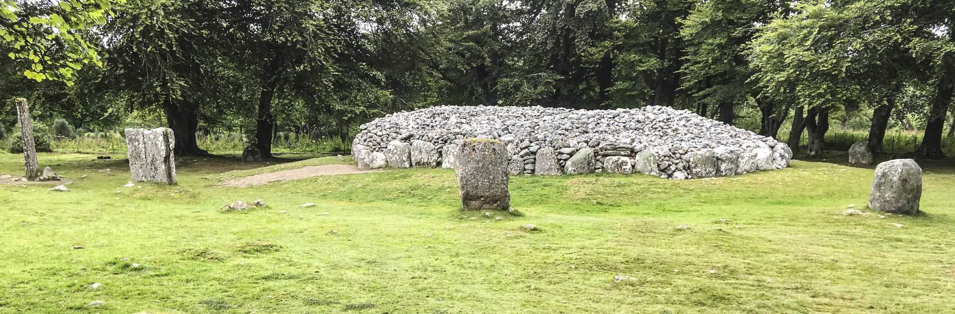 Clava Cairns is a late Neolithic/early Bronze Age site of burial cairns and standing stones. Three massive cairns dominate the site, originally constructed around 2000 B.C., two of them with passages aligned to catch the sun’s rays on the winter solstice. Over the next thousand years and more, the cairns were re-used for further burials, and other monuments and smaller cairns were built. Carol provided wonderful commentary on the site, and we all enjoyed a stroll around the cairns and stones under the cover of large beech and birch trees, planted by the Victorians. Trees didn’t grow here when the solar-aligned monuments were built!