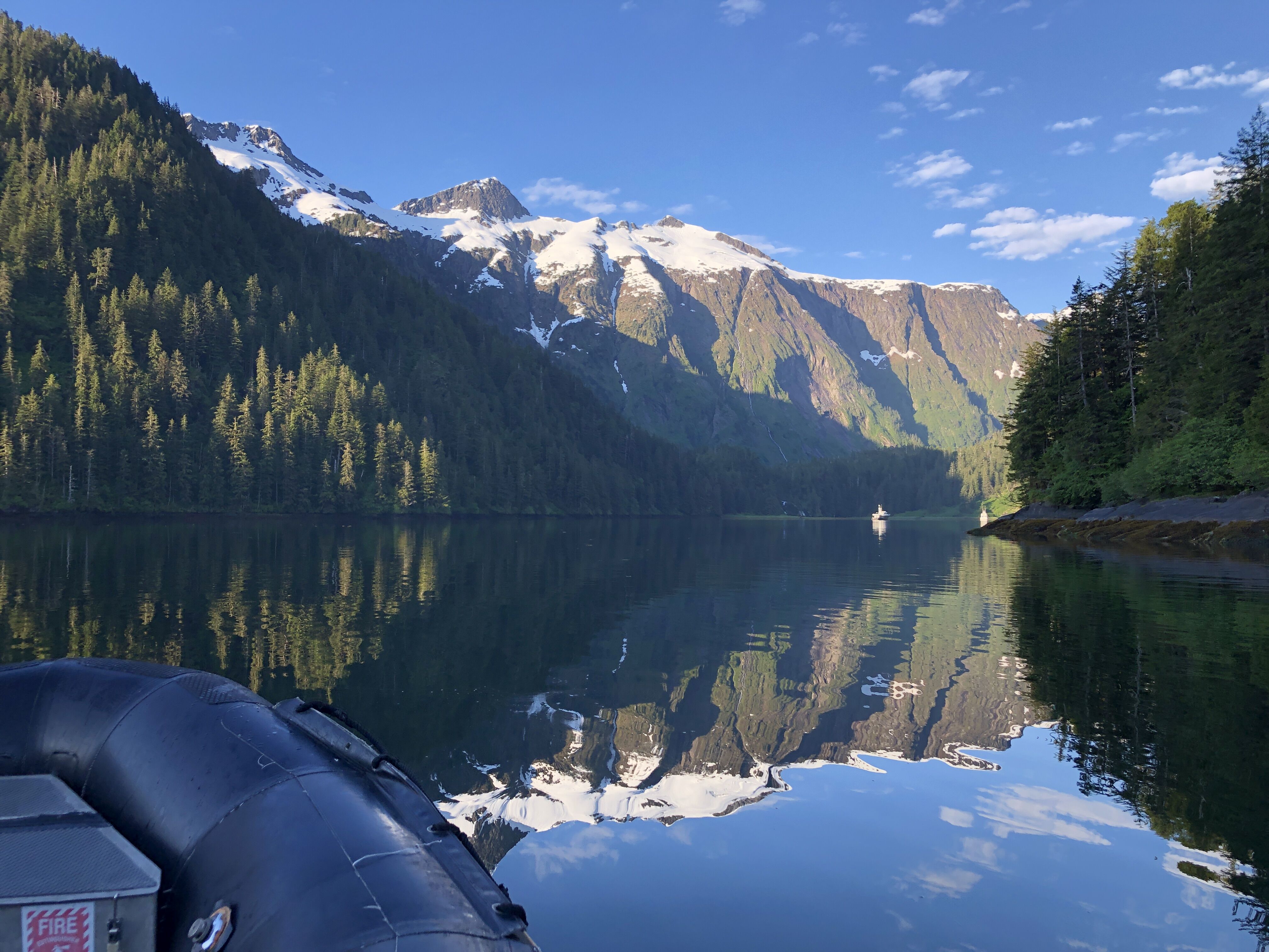 Our expedition leader, Shawn Lucas, had an idea to visit a strikingly beautiful place that is only accessible when wind and tides oblige. Today they did, and the sun came out as well, giving us a remarkable day in Deep Cove and Patterson Cove. Shawn encouraged the entire group to awake early — so the staff was on shore scouting out the trails by 6:10 a.m., and leading guests by 7:00 a.m. This gave us pond-smooth waters for reflection photographs, and calm Zodiac tours to explore hidden coves. The plan allowed us to spend hours finding and observing dozens of rounds of bubble-net feeding by humpback whales. Planning, weather, sunshine, and animal life, all combined for a magical day.