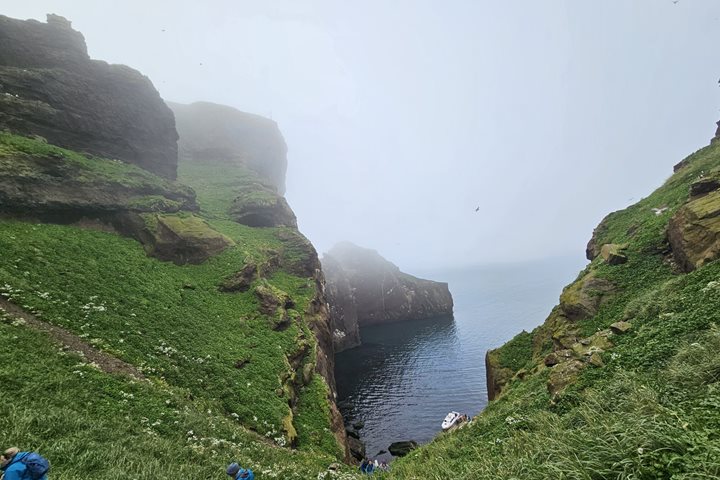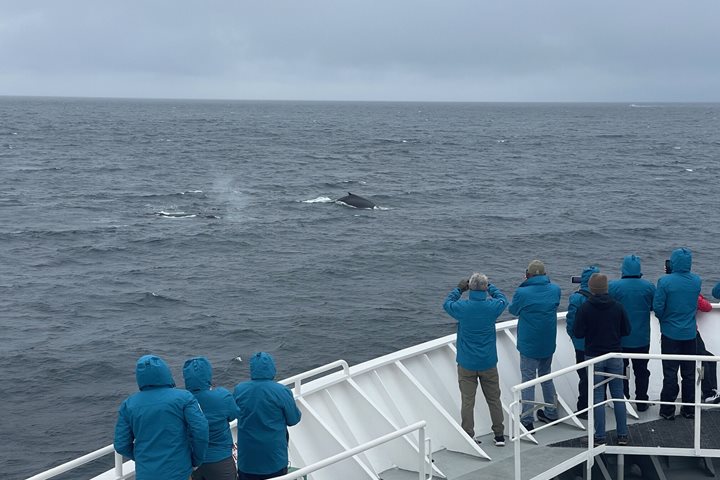 Today we sailed to the beautiful and remote village of Djúpavík, nestled at the back of a deep fjord on the Strandir coast of the Westfjords. After landing ashore, we split into small groups to explore the highlands on foot. Our hikers looking for a more strenuous route scaled the towering basalt cliffs and hiked a beautiful loop atop the plateau overlooking the fjord. We put our boots to use crossing several streams that fed the waterfalls framing town. Other hikers looking for a more leisurely route hiked a scenic loop that ended at the historic Herring Factory Museum where we were given a tour by a local guide. We also timed our visit well because the President of Iceland happened to be visiting the fjord and a few lucky members of the group were able to meet him! We were grateful for the sun and are looking forward to more adventures tomorrow.