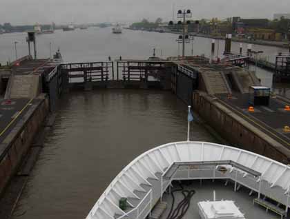 Not long into the morning stretch class, one of the naturalists came back with index finger over lips and a “shhhhh…” to let us know there was a black bear along the shoreline.  Many chose to move to the railing and put cameras and binoculars to eyes.  Those who remained came into a tighter-knit group and whispered so as not to disturb the bear or viewers.  A magical element hung in the misty air.  And then, off the stern of the ship, the vivid bands of red, orange, yellow, green, blue, indigo, violet… a rainbow!  How fitting for our first day on board.  The expedition had officially begun.