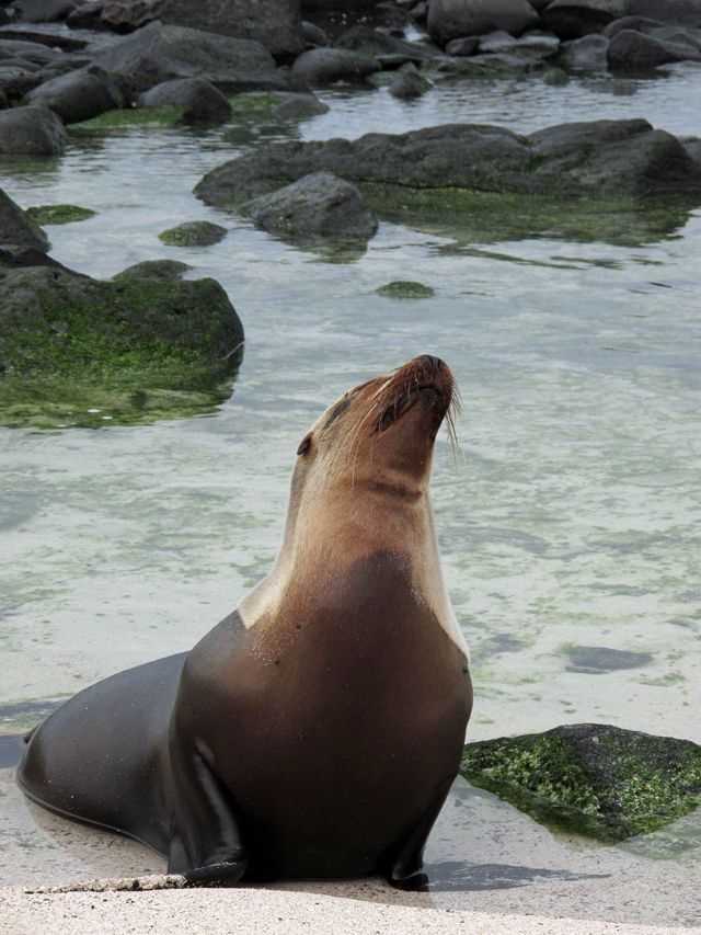 Considered one of the highlights of the Archipelago, Española lies in one of the most productive regions of the Galápagos waters. Small and flat-topped due to millions of years of erosion, it is the home to various species that are endemic to Española, found nowhere else in the world. Gardner Bay, located in the north of the island, is a large beach with white, coralline sands preferred by a colony of Galápagos sea lions. The snorkeling in the nearby islets was amazing, with first close encounters with passing sea lions and large schools of fish. At the western tip of Española lies Punta Suárez; it is considered one of the highlights of the archipelago as the place teams with wildlife: endemic Española mockingbirds, Galápagos sea lions, marine iguanas and the majestic waved albatross.