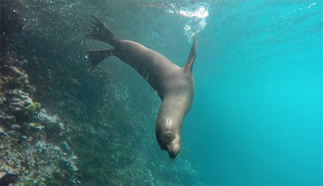 Today’s expedition took place on the oldest island of the Galapagos Archipelago, Espanola Island. Espanola Island is about 3.5 million years old and it is incredible to think and realize that the first plant and animal colonizers arrived to this island. Our expedition in Espanola Island started in the water with a beach snorkeling from Gardner Bay beach and a deep water snorkeling for more experienced snorkelers. In the water playful juvenile sea lions, who followed us along our snorkeling playing with our bubbles and fins, welcomed us. After snorkeling, we rested on beautiful Gardner Bay beach, a white flawless sand beach where a big colony of sea lions rest and nurse their young. As we arrived to the beach, curious Espanola mockingbirds saluted us sitting on our hats and backpacks and Espanola lava lizards walked along the rocks marking their territories and displaying mating behaviors.