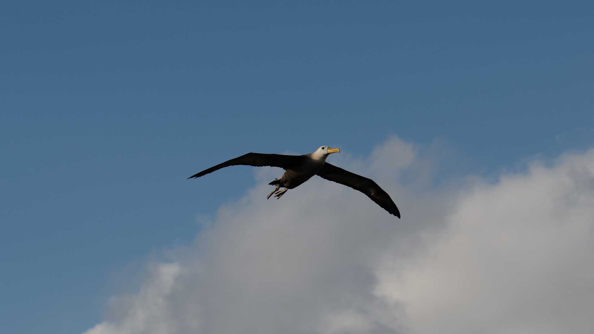 In the afternoon, we visited Punta Suarez, home to the waved albatross, found only on Española Island. Unmistakable, even at sea, by its size and extremely slender wings, it is the largest bird in the Galapagos, with a wingspan of up to 7.5 feet. Waved albatrosses mate for life and return to Española Island each year to breed. The best time to see them is from April to December, when they are nesting and raising chicks. Although we were able to visit only one portion of the island, we were lucky to spot dozens of these birds. We saw them courting and nesting and even spotted some eggs.