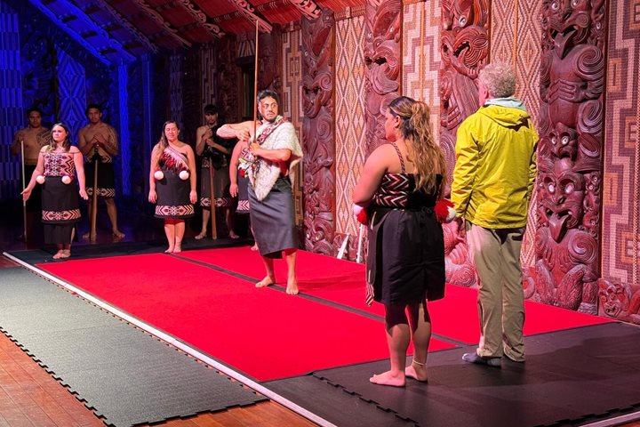 Guests aboard National Geographic Orion cruised by Whakaari White Island on our way to the Port of Tauranga in New Zealand’s Bay of Plenty. As the ship cruised the coast, guests spotted a number of seabirds, including diving and storm petrels and sooty shearwaters. Once in port, guests ventured inland to Rotorua. Also known as “Sulfur City”, this area is known for its rich Maori culture and unique geothermal hot springs. Guests visited Te Puia, a cultural hub dedicated to preserving Māori traditions. Here, they had the opportunity to engage with local artisans at the arts school, witnessing the intricate craftsmanship of traditional carving and weaving. Participants enjoyed hands-on demonstrations and learned about the significance of these art forms in Māori culture. The day's excursions not only provided breathtaking views and unforgettable experiences but also deepened the guests' understanding of New Zealand's cultural heritage. As the sun set over Tauranga, National Geographic Orion prepared to continue its journey, leaving behind a lasting impression of this remarkable destination.