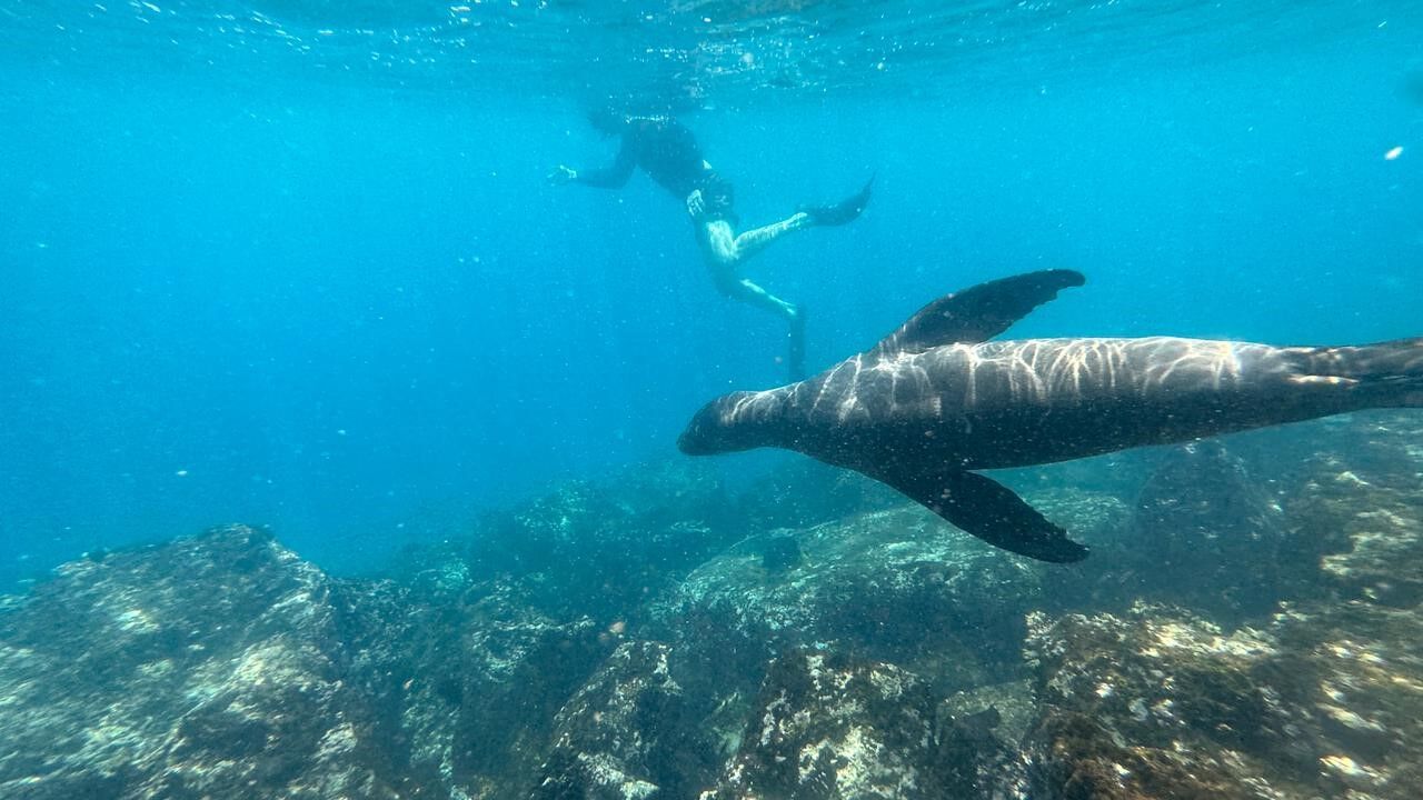 After our visit, we came back on board and enjoyed a great breakfast. Later, we prepared for a Zodiac ride around Champion Islet, followed by snorkeling. Being in the water today was quite a unique experience. We had amazing visibility and were in the company of various species, including colorful fish, sea turtles, sharks, and sea lions.