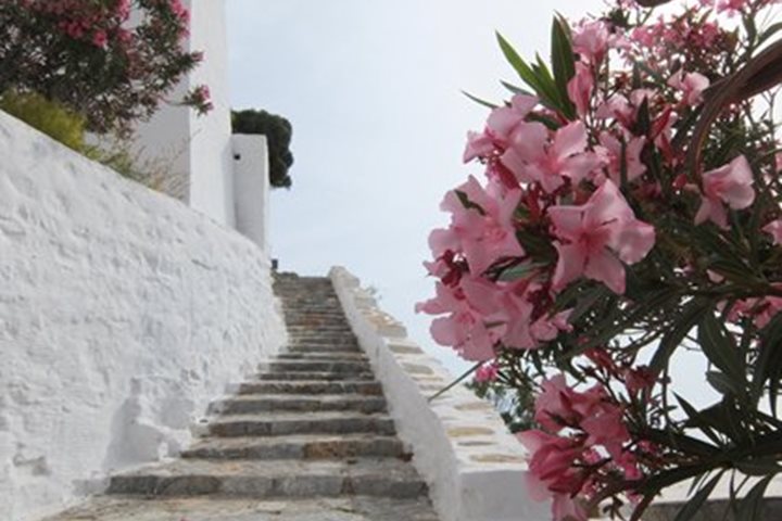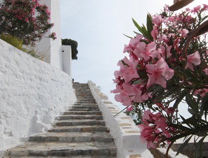 After a delicious buffet lunch on the lido deck we disembarked on our tenders to visit the tiny island of Foelgandros—a lesser-known Cycladic Island most had never heard of. A local bus took us away from the port village of Karavostasis up to the main town of Kastro. In antiquity the main town was even higher up the mountain, but in the 13th century it was transferred to its present location. After the 4th Crusade the Venetians took control. The capital of the Duchy of the Archipelago was on Naxos and they controlled all of the islands of the Cyclades. Some of us hiked up the hill to the Church of the Dormition of the Virgin Mary and some went into the Kastro for a guided walk.