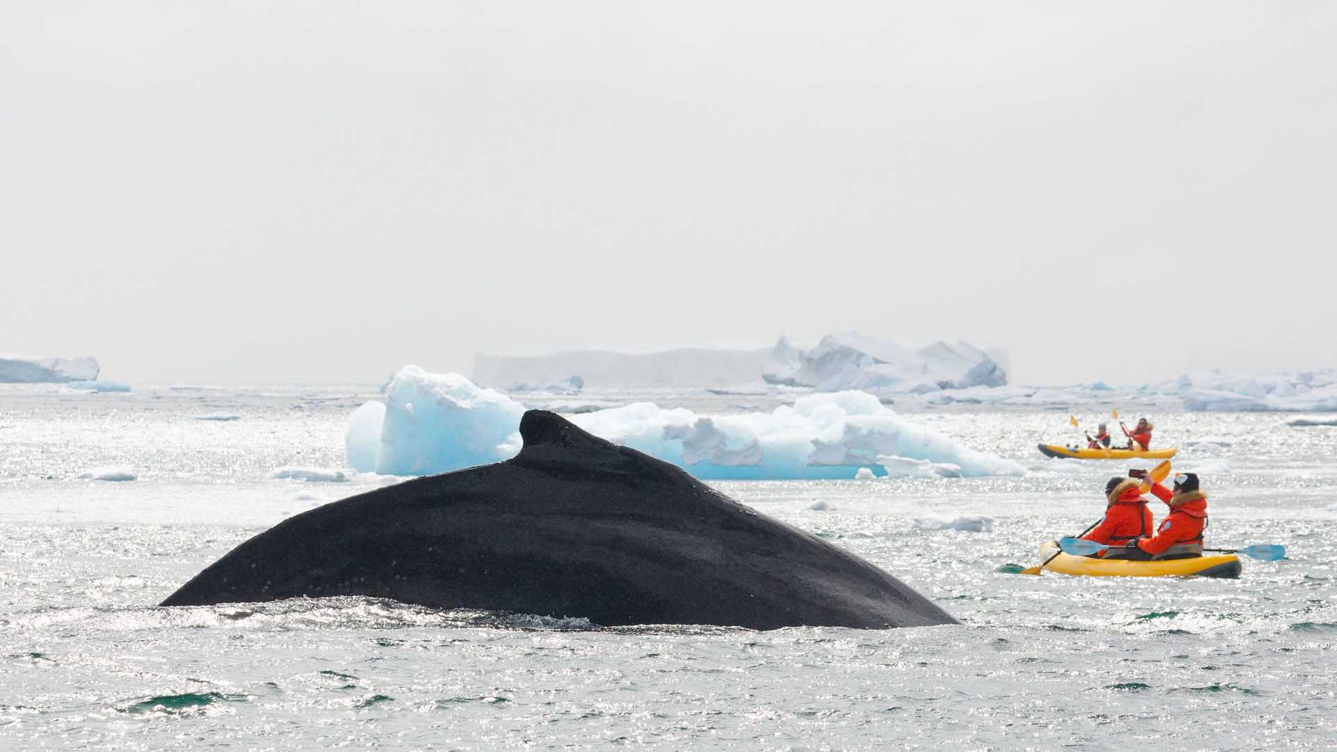 It was a whale of a day! The total lack of wind created a flat sea surface illuminated by partly sunny skies with a touch of fog, perfect conditions for kayaking and Zodiac cruising. Kayakers paddled among icebergs and/or just sat and enjoyed the vistas. The occasional humpback surfaced, sometimes unexpectedly near a kayak, providing an exciting exclamation point. Zodiac cruisers ventured farther from National Geographic Explorer and encountered 20-25 humpbacks scattered over a wide area. Many were lunge feeding - rising slowly from the depths with hundreds of gallons of water and krill in their large mouths which then was filtered through their baleen to retain the krill. As the whole process can be a bit messy, dozens of fulmars darted about the feeding whales to snatch leftovers.