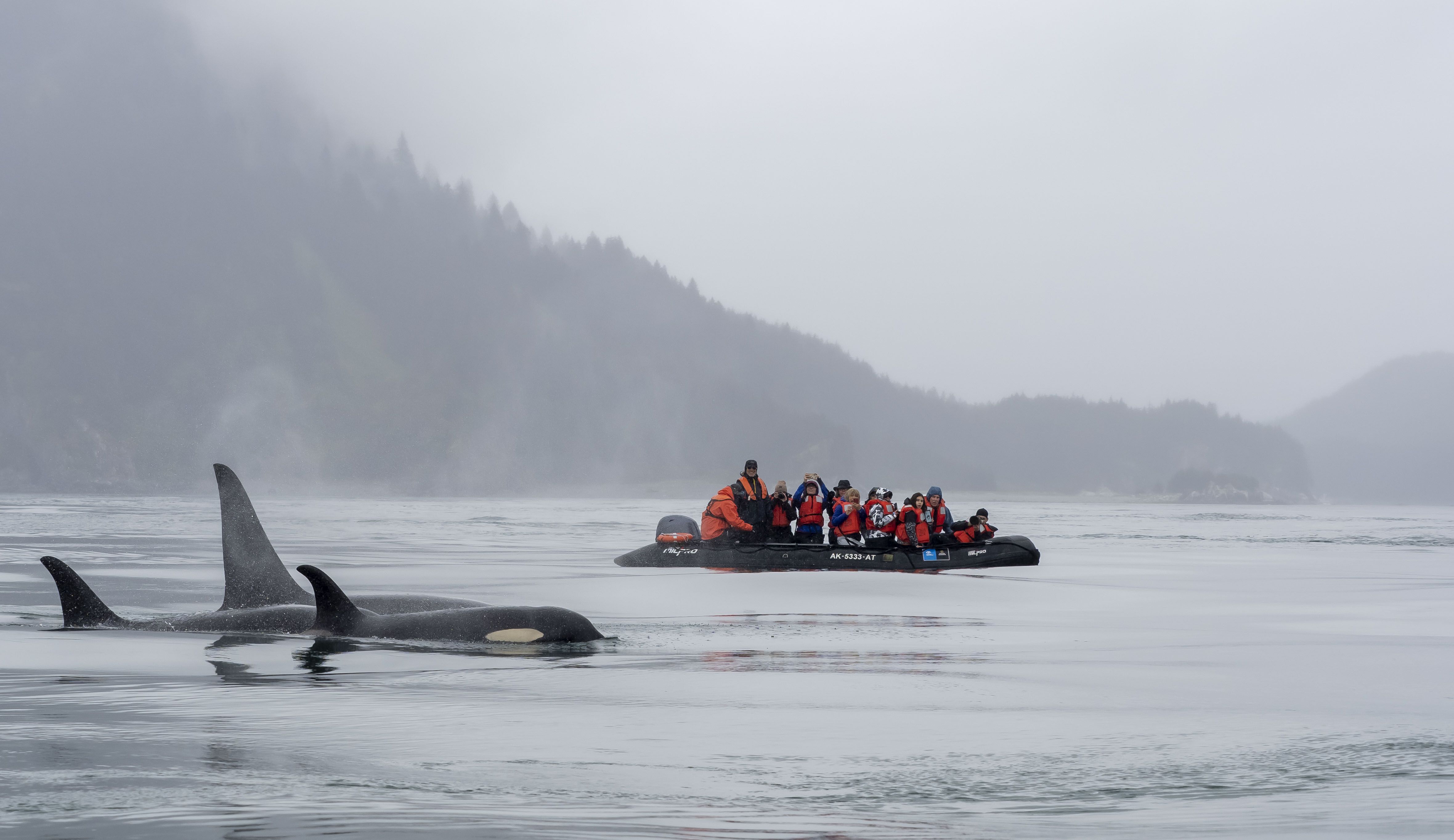 Most trips to the Inian Islands can be very exciting, but today’s trip brought nearly endless surprises. The excitement began just as we loaded up into Zodiacs with the call to drivers that a small pod of killer whales had been spotted off the stern. These animals are often somewhere in the area, but it is not frequent that we can view them from Zodiacs. All boats were able to catch up to the whales to get closer looks, watching respectfully as the four animals purposefully moved past the northernmost Inian Island and into the gulf. Gulls and the occasional puffin made passes as we all watched from our Zodiacs on choppy seas. During the flurry of activity, we noticed humpback whales breaching offshore. Boats of passengers and staff dispersed to watch both cetaceans put on their respective shows.
