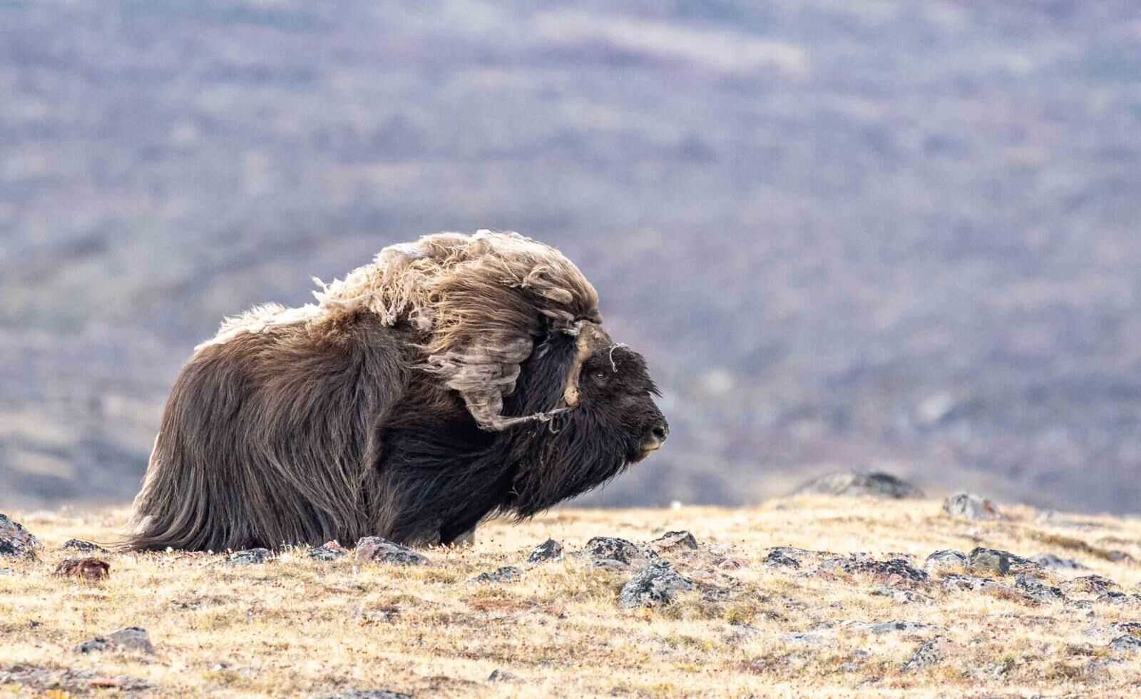 We began the day by cruising in the eastern part of Lancaster Sound, heading through increasingly dense ice towards our destination in Frem Fiord. During the morning, we had the pleasure of another presentation by guest speaker Eva Aariak, in which we learned more about the current situation of Nunavut and what the future holds for the Inuit people. In the afternoon, the majority of the expedition landed on the shores of Frem Fiord, where they were greeted by musk oxen, while our divers took a splash in the cold, murky waters of the fiord.