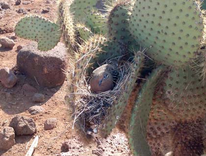 After a delicious buffet breakfast we landed on a lovely white sand beach and set off for a choice of two walk options: an easy one along the sandy beach margin of the shore or the beach margin plus an extension on very rough lava field to a lookout across the bay. These walk were amazing! There were seabirds nesting and resting everywhere—the elegant nocturnal swallow tailed gulls and Nazca boobies were on the ground, in the sand and between the lava rocks, the red-footed boobies and great frigatebirds had nests in the salt bushes and mangrove trees. Baby boobies at all stages of development were seen: fluffy white chicks, funny-looking young birds that were sprouting feathers between their down, and juvenile birds flapping and strengthening their wings as they prepare to take flight. Some frigates were already incubating eggs while other lone males spread their wings, fluttered and cooed, with their red pouches extended as they tried to attract a mate.