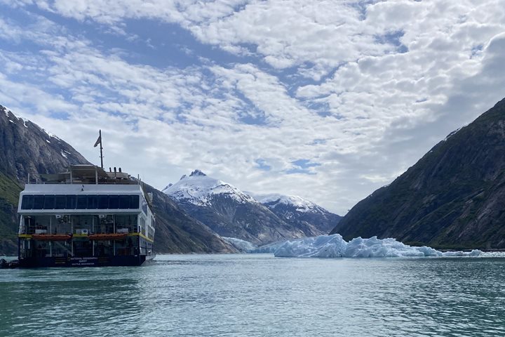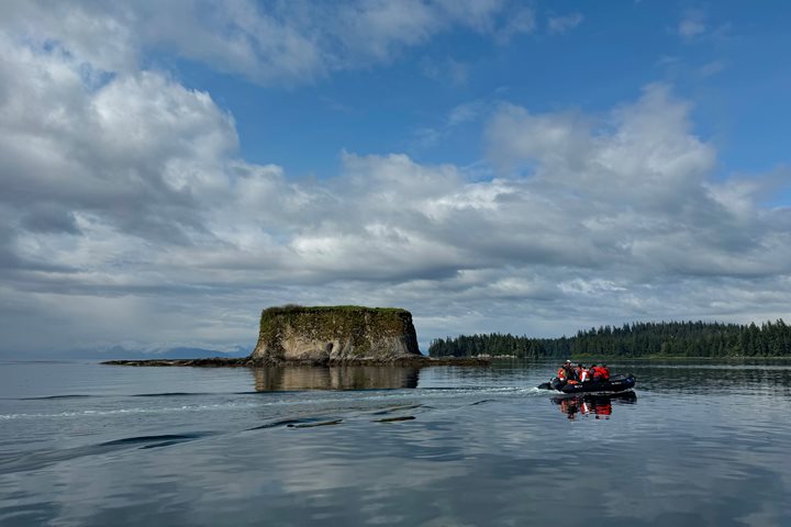 We spent our day exploring this biologically rich area. First stop: George Island, a beautiful piece of Southeast Alaskan rain forest and the site of WWII gun emplacement designed to protect this strategic waterway. All ashore were treated to the low tide-pooling creatures, including barnacles, crabs, and sea stars. Longer hikes walked up to the cannon, while shorter hikes crossed the narrow island to the beach on the other side. Kayakers and expedition landing craft cruises explored the shoreline’s waterways and high cliff walls. Rain continued to fall in varying degrees, but it didn’t seem to faze anyone.