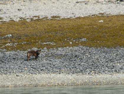 At the entrance to Tidal Inlet, sharp eyes on board saw a dark mammal on rocks near shore. It disappeared, and when we saw it again, we saw that it was a brown wolf! We were very excited by this sighting, since wolves are rare to see. Further into the Tidal Inlet, there was an enormous brown bear, but we didn’t watch that bear for long, because there was another brown wolf close to shore. We watched this second wolf turn over big clumps of mussels, and dig underneath them, looking for things to eat.