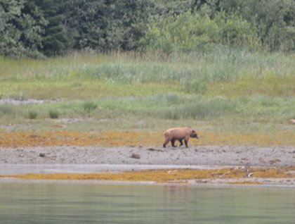 As we traveled up Glacier Bay, we marveled at all the landscape and seascape features trying to imagine what a tremendous glacier filled this large bay just 250 years ago! We went into narrow Tidal Inlet and scanned the coast—all of a sudden, we saw two large brown bears foraging along the coast! With hushed whispers we “ooohed” and “aaahed,” as the bears overturned rocks looking for blenny fish, really just waiting for their feast to begin—the salmon to start returning to the stream! Later, we were lucky to get a good look at a foraging black bear in Geikie Inlet, too!