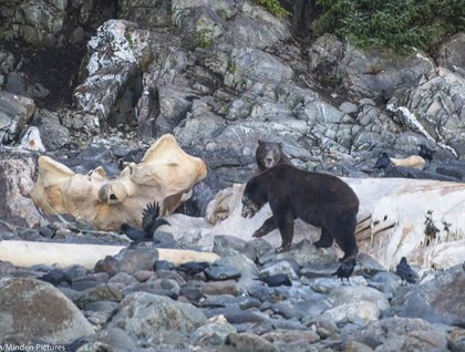 On our return journey, we had a brief view of a brown (grizzly) bear walking along the shoreline, and later we were fortunate to see a black wolf! It was fun to watch this canid hunting - pouncing and munching, probably on small rodents. Then at Gloomy Knob we observed several mountain goats grazing on the hillside wearing thick furry coats, ready for winter.