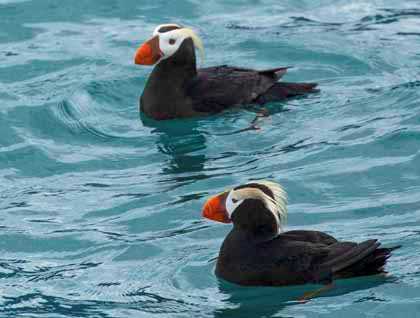 After breakfast, we all got great looks at tufted and horned puffins at South Marble Island. They flew around us and dove underwater for food. Some of them came close enough for us to take nice photographs. This little island and the few nearby islets offer a perfect habitat for nesting puffins, as well as hundreds of black-legged kittiwakes. Furthermore, the experience is complimented with more than 200 growling Stellar sea lions, and a variety of other sea birds like common murres, pelagic cormorants, marbled murrelets, and pigeon guillemots. It was a very exciting start to our day.