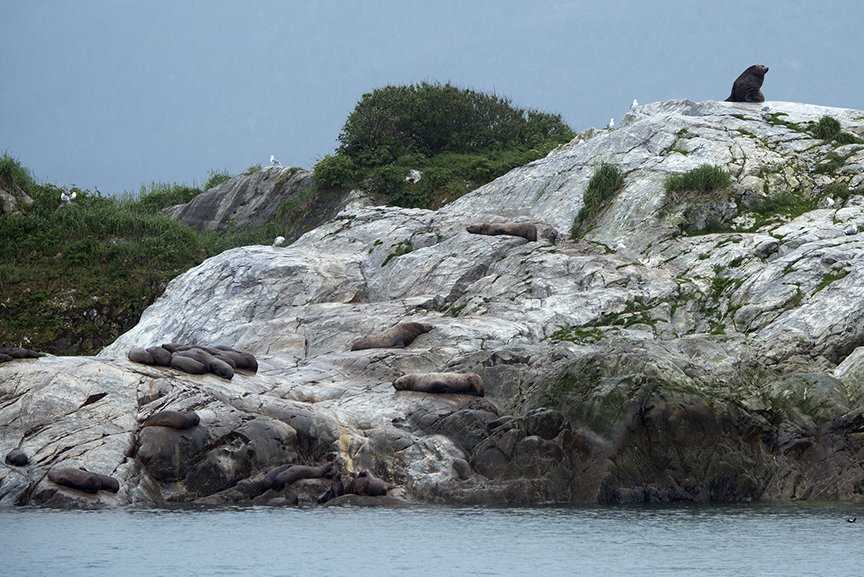 Grand Pacific Glacier buried Glacier Bay 250 years ago. Today we cruised 60 miles north to see the dark, rocky face of the glacier, and the beautiful white face of Margerie Glacier next to it. The recently uncovered shores and waters have transformed into a rich habitat for mountain goats, brown bears, Steller sea lions, sea otters and humpback whales, all of which we observed during the day.